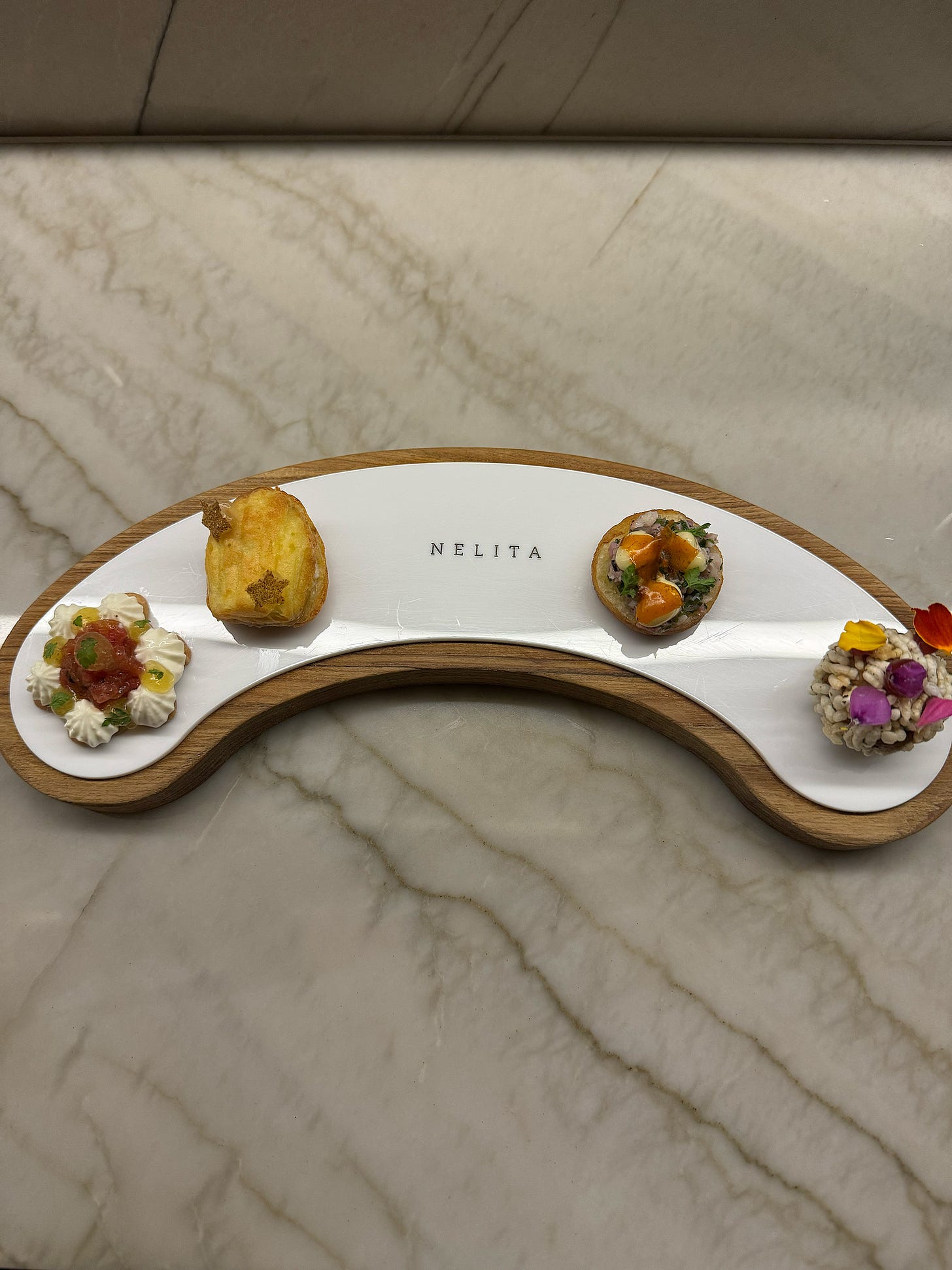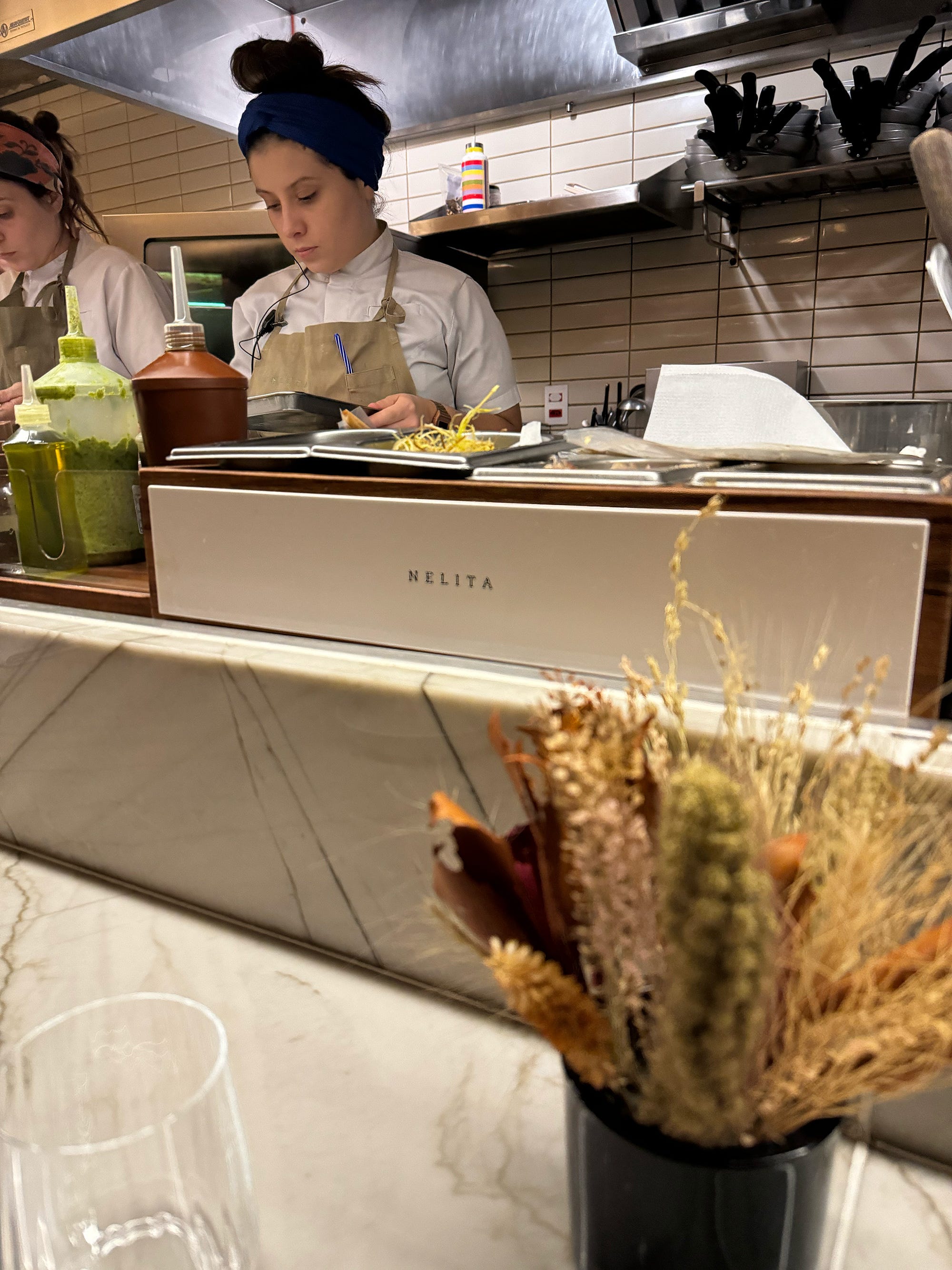 Helmed by chef Tássia Magalhães, Nelita is nestled amongst restaurants and bars on a lively street in the Pinheiros neighborhood of São Paulo. It has an inviting atmosphere, with warm lighting and exposed brick, the open kitchen set about 2/3 of the way into the restaurant, with a few tables at the back. A counter runs along the kitchen area where you can watch the chefs as they prepare your meal.
